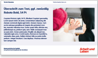 Die Umsetzung der PowerPoint-Charts orientiert sich an den Gestaltungsparametern der Corporate Design Grundlagen. Die Titelfolien ermöglichen den plakativen Einstieg in das Thema und zeigen das Logo von Arbeit und Leben als präsenten Absender. Die horizontale, zentrale Bühne der Inhalts-Folien bildet den Fokus der Charts und trägt die zu präsentierenden Inhalte.