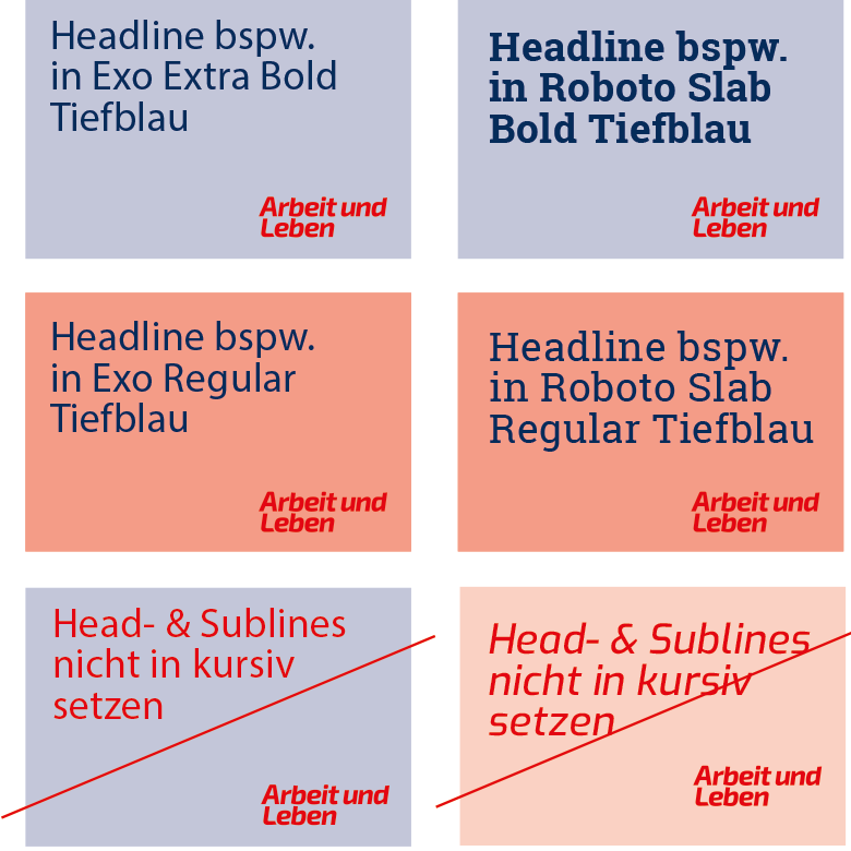 Head- und Sublines werden in Tiefblau – oder bei Textzusätzen innerhalb der Headline in definierten Rastertönen – gesetzt.